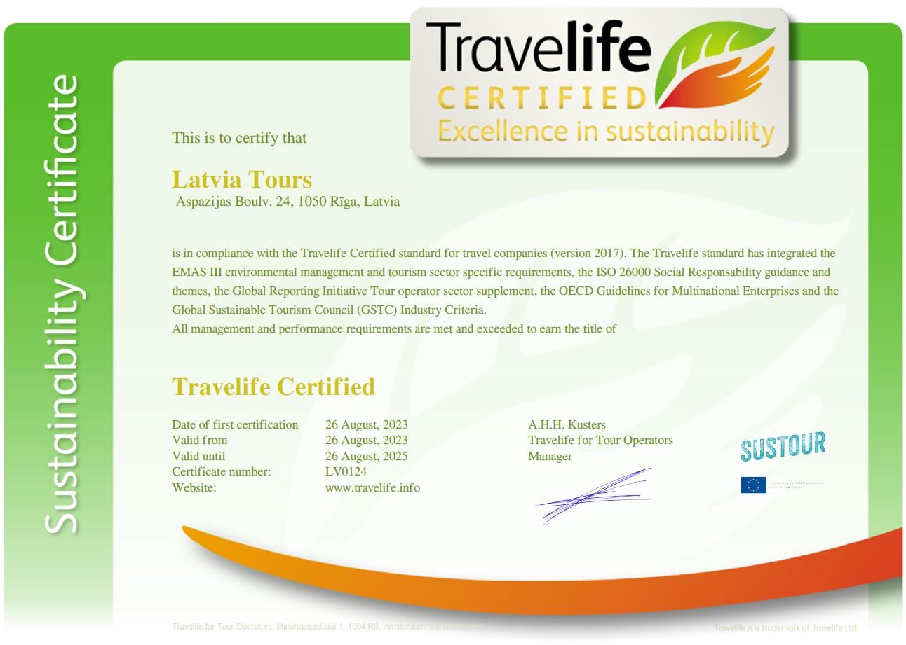 Ar prieku un lepnumu informējam, ka tūrisma aģentūra "𝐋𝐚𝐭𝐯𝐢𝐚 𝐓𝐨𝐮𝐫𝐬" ar ALTA un ECTA atbalstu projekta EU SUSTOUR project ietvaros ir kļuvusi par Latvijā pirmo tūrisma aģentūru, kas ieguvusi godpilno "𝐓𝐫𝐚𝐯𝐞𝐥𝐢𝐟𝐞 𝐜𝐞𝐫𝐭𝐢𝐟𝐢𝐞𝐝" statusu.